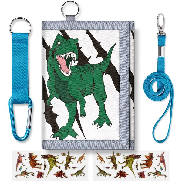 - 【Package Includes】 This trifold kids wallet comes with 1x lanyard, 1x carabiner clip and 2x 3D dinosaur stickers.