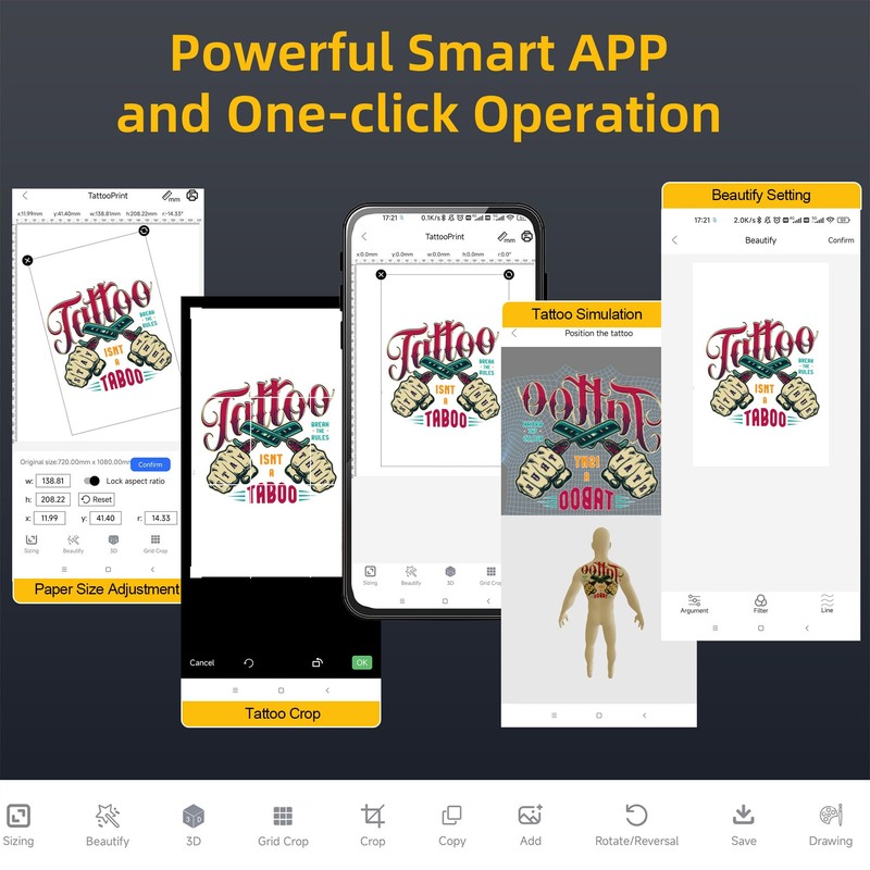 - Powerful Smart APP: By using our powerful "TattooPrinter" APP, built in multiple tattoo patterns, supporting uploading, editing, realistic printing, and 3D printing simulation of tattoo patterns, etc. With one-click operation, transfer printing can be completed in just a few seconds, making it more convenient and efficient.