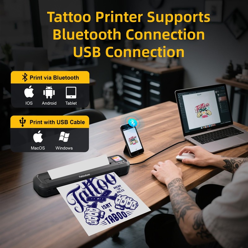 - Bluetooth Tattoo Printer: The tattoo machine uses Bluetooth 5.0 connection technology for more stable connection, with a maximum connection distance of 30 meters. Tattoo printer machine has good compatibility, supporting Bluetooth connection printing compatible with Android&iOS, and USB connection printing compatible with MacOS&Windows.