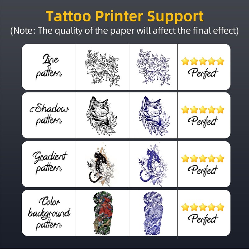 - Upgraded printing effect: Our stencil printer has been upgraded in technology. The tattoo stencil printer not only supports printing line tattoo patterns, but also supports printing gradient tattoo patterns and ultra clear realistic color background tattoo patterns, with higher transfer and replication rates. The tattoo machine adopts thermal printing technology, which is easy to maintain and use.