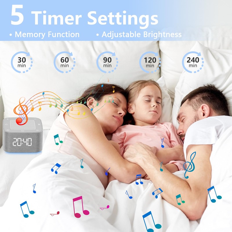 - 🌅【5 Timers & Adjustable Alarm Clock】 Our sleep sound machine alarm clock features a dimmable display (Off/10%/50%/100%) to avoid affecting sleep at night. 5 Timer Options: 30 min/ 60 min/90mins/ 120mins and 240mins intervals with auto-off settings. Timing function lets you free your hands. This sound machine baby remembers the last sound, light and volume level you selected when restarted, no nightly reset needed.