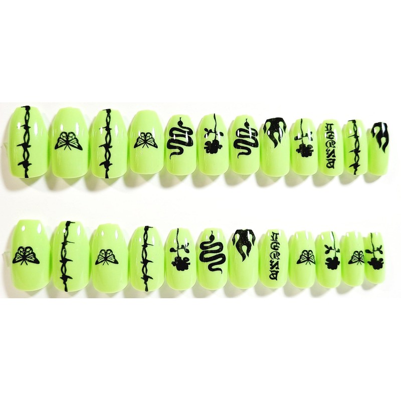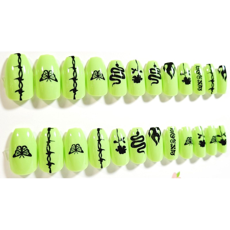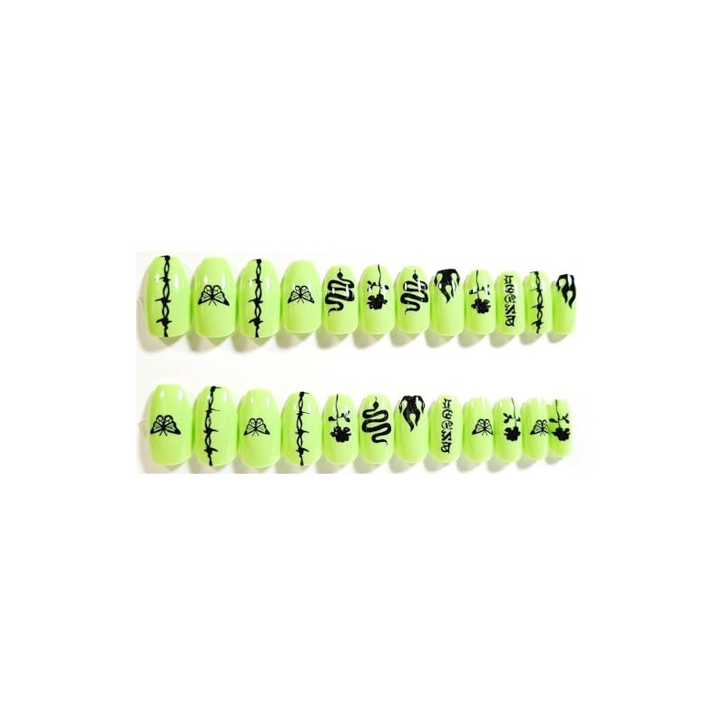 • These fun, glossy nails feature neon green base nail with a black tatoo design on every nail. Short length means all day, natural, functional wear without any hassle.