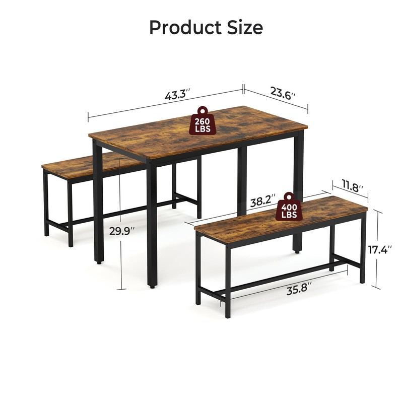 • 【Durable Construction】 Crafted from durable technology wood and steel frames, this dining table with bench ensures long-lasting use; the table holds up to 200 lbs, and each bench supports up to 400 lbs, offering reliable stability for everyday use