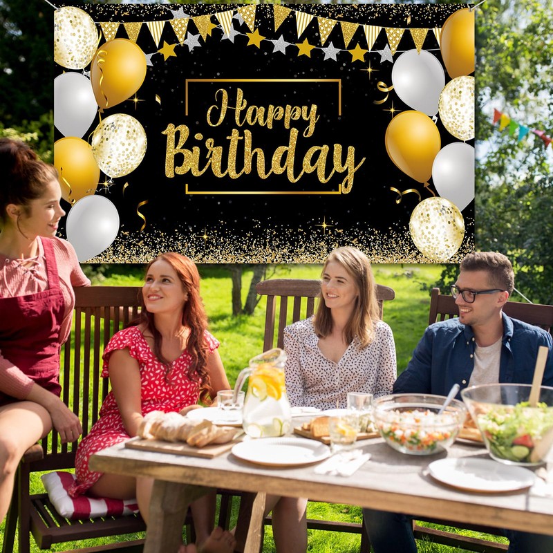 - Package Content: you will get 1 pcs happy birthday sign backdrop, designed in black and gold, and printed with classic patterns of balloons, gifts, glittery stars, adding an impressive touch to the birthday party, serving as an ideal decoration for creating a birthday memorable atmosphere