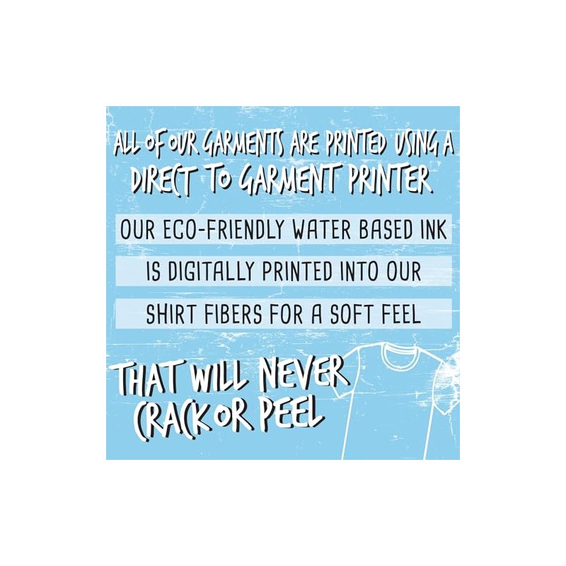 - Our eco-friendly water-based ink prints directly into our shirt fibers for a smooth feel that provides a less vibrant, lived-in look. (No cracking or peeling like screen printing or iron-on transfers)