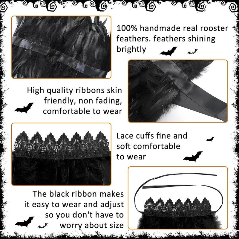 - High quality: this carnival spring collar black is made of high-quality feathers. The high-quality material, the comfortable wearing comfort and the feather collar give this feather cape costume an elegant touch that immediately catches the eye. A must-have accessory for women who like gothic clothing.