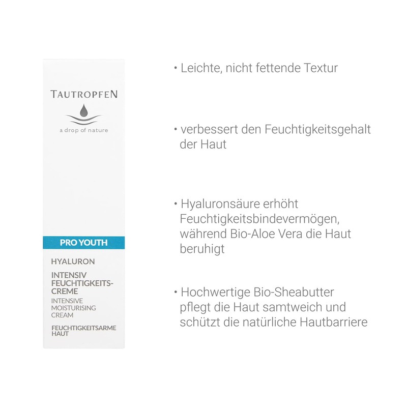 - Pro Youth moisturising cream from dewdrops: our supple moisturising face cream with botanical hyaluronic acid provides your skin with intense and long-lasting moisture. Hyaluronic acid attracts moisture and helps lock it in the skin. At the same time, it ensures a smooth and radiant appearance.