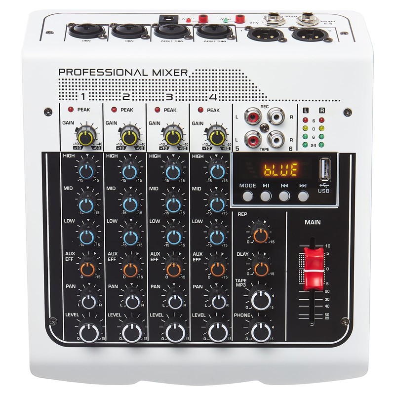 - 【6-CHANNEL AUDIO MIXER】This mixer is perfect for DJs and musicians looking for versatile equipment. With options for 4 microphone inputs, REC & TAPE input, and a built-in DSP sound effects processor, you can easily create a professional sound experience. The mixer also features a headphone output jack for private monitoring.