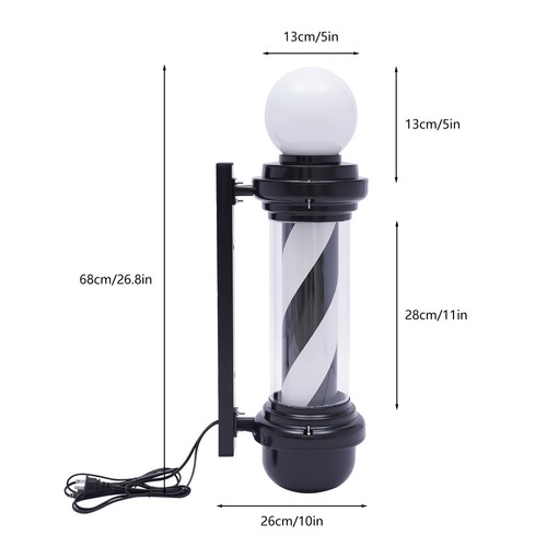 High Brightness: It has an upper lamp and a rotary lamp, and uses LED lamp beads, with high brightness and long life. It can make your store become the most conspicuous one on the whole street! | Gorgeous Appearance: The rotating light is the sign of a classic barber shop with rotating black and white lights, which could make your store more recognizable compared to other stores and even attract more customers. | Low Consumption: Barber pole LED light uses a 20w LED light, and compared with ordinary bulbs, it is more power-saving and environmentally friendly. |
