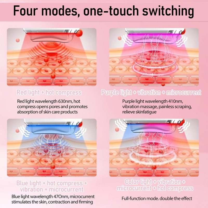 - 【4-in-1-Multifunktions Gua Sha】A: Wärme + Rotes Licht: Aktiviert die Zellen, fördert die Blutzirkulation und bringt den Teint zum Strahlen. B: Violettes Licht + Mikrostrom + Vibration: Fördert den Lymphstoffwechsel und verbessert fahle Haut. C: Blaues Licht + Wärme + Mikrostrom + Vibration: Strafft die Haut, verbessert die Talgproduktion und fördert die Nährstoffaufnahme. D: Wechselndes Rot- und Blaues Licht + Wärme + Mikrostrom + Vibration: Der kombinierte Modus für eine umfassende Hautpflege
