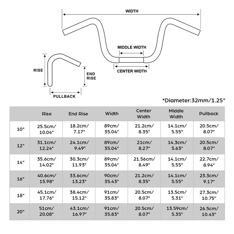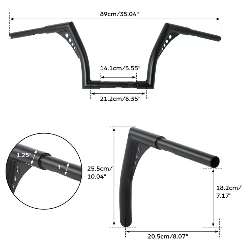 Center section and tips taper to 1" so that standard handlebar controls fit