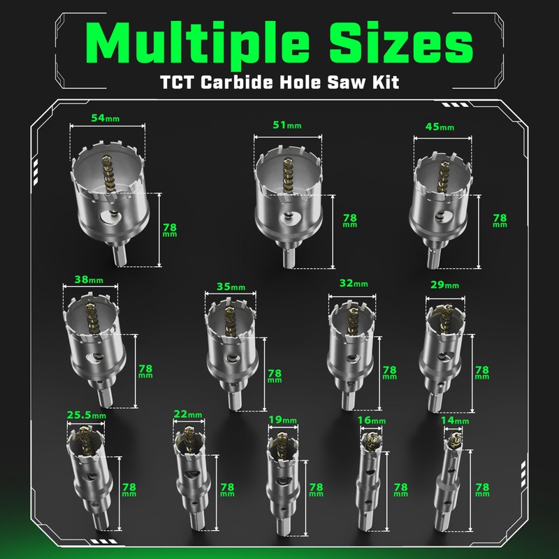 - Various Sizes: Our unique hole saw kit for metal offers 12 TCT hole saws of the sizes: 2-1/8"(54mm), 2"(51mm), 1-3/4"(45mm), 1-3/8"(35mm), 1-1/4"(32mm), 1-1/8"(29mm), 1"(25mm), 7/8"(22mm), 3/4"(19mm), 5/8"(16mm), (15mm), (14mm).