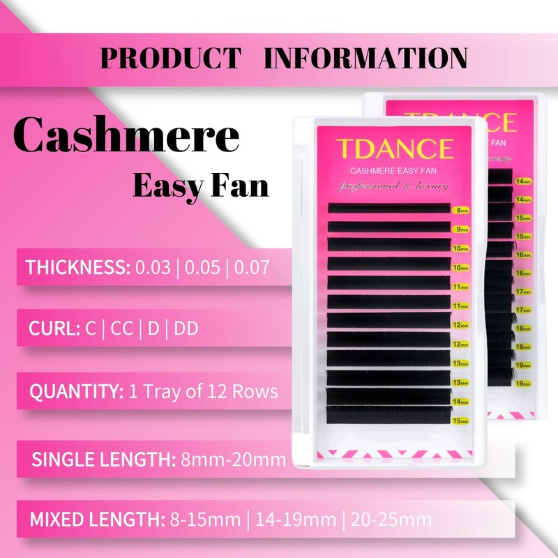 - 【Different specifications easy fan lashes can be chosen】 Thickness:0.03/0.05/0.07 Curl:C/CC/D/DD Length:8-20mm Single Length, 8-15mm&14-19mm&20-25mm Mixed Length. 12 Rows/Tray. The cashmere eyelash extensions are very lightweight and fine lashes suitable for multiple russian volume fanning techniques.