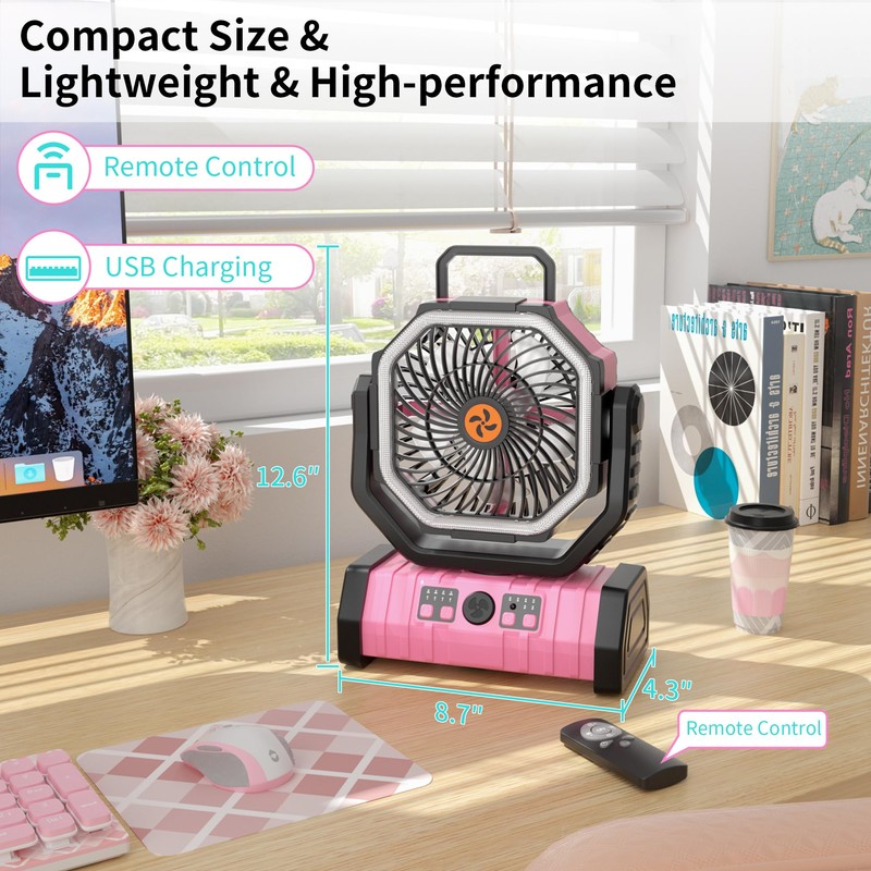 TDLOL Rechargeable Fan Battery Powered Fan, Portable Fan Camping Fan with LED Lantern,270°Auto-oscillating Battery Operated Fan,USB Personal Desk Fan with Hook,8H Timer Camping Fan for Tents Pink Fan