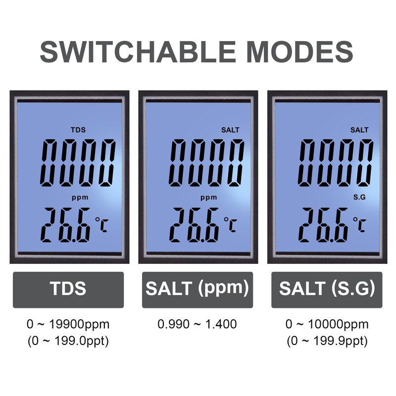 - TDS: 0~19900ppm / 0~199.0ppt