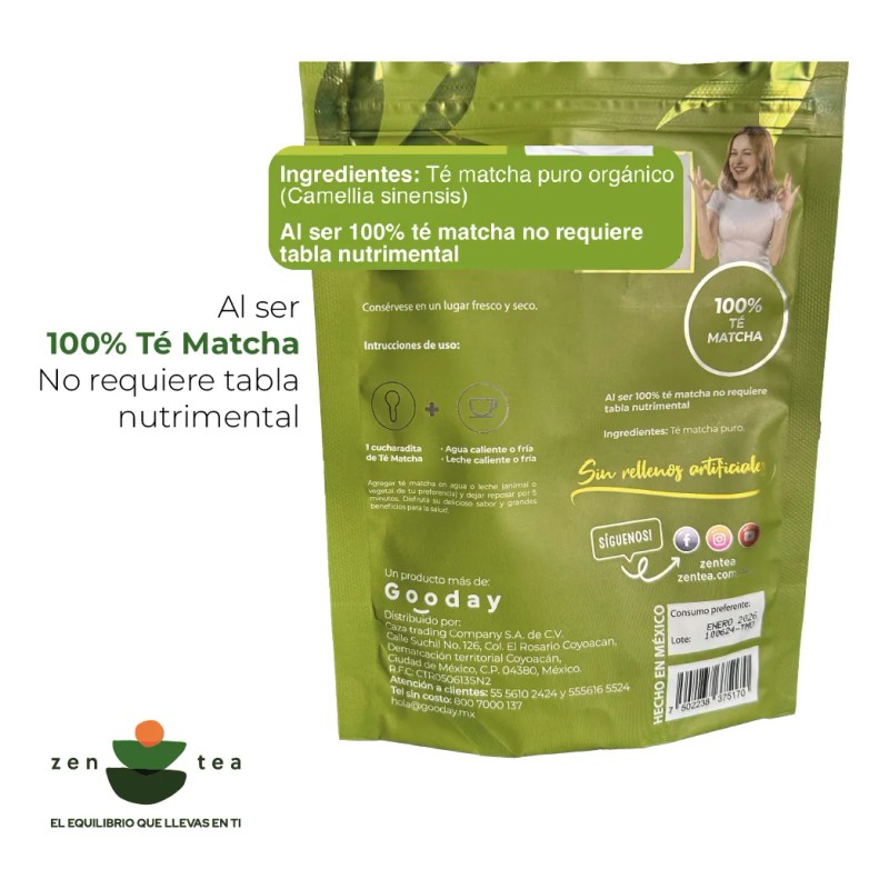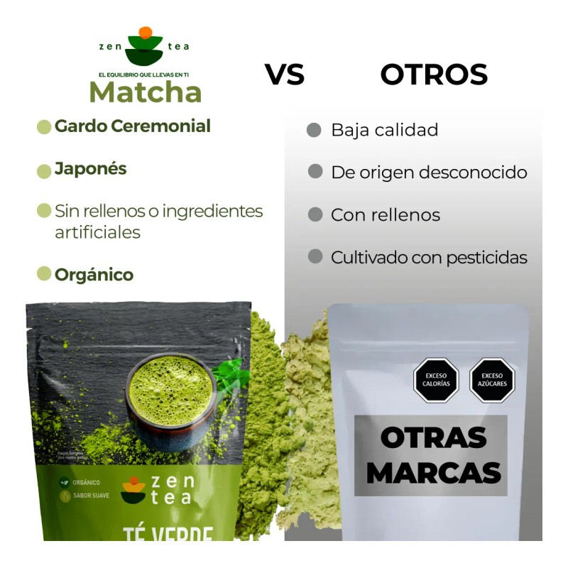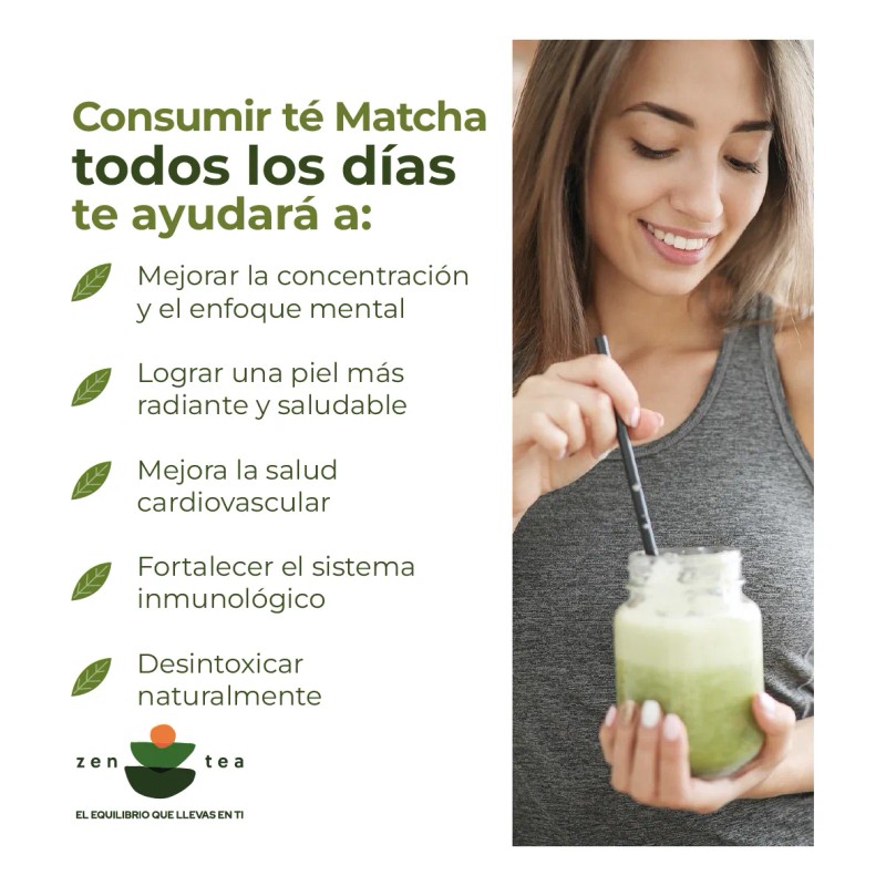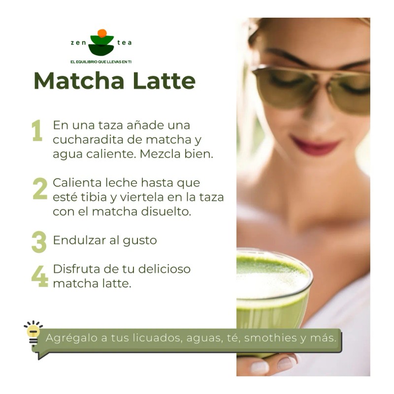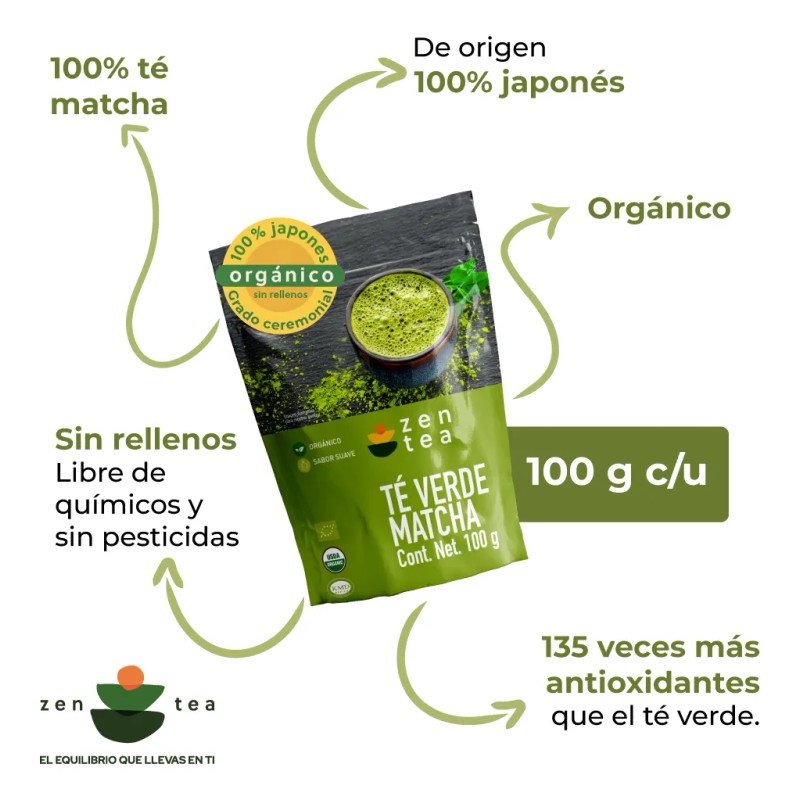 Origen: Té Matcha de origen japonés, envasado cuidadosamente en México.
