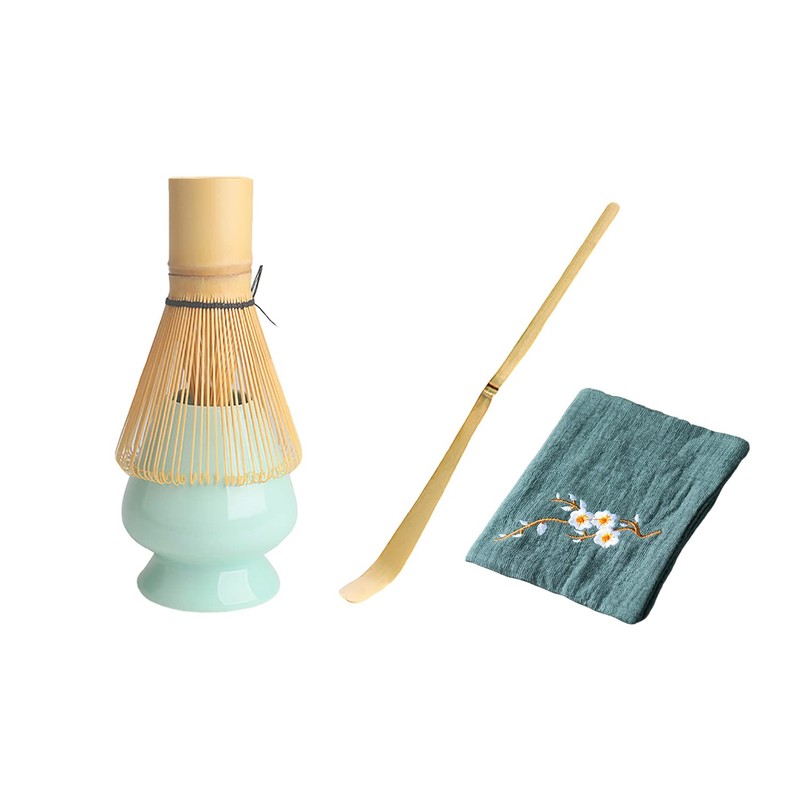 Tea Whisk Set, 100 Bonpons Chasen, Chasen Stand, Kusedai, Chasaku, Tea Utensil Set, Matcha Whisk Set, Matcha Tea Whisk Set, Green Tea Towel (Green)