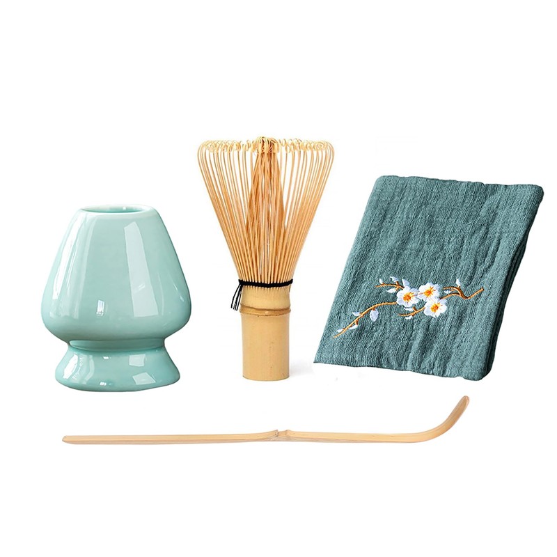Product Description: A 4-piece set of chasen, chasenachi (dull), tea ladle, and tea towel.