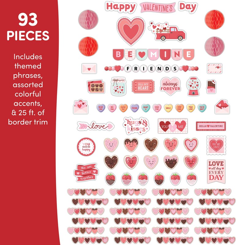 - INCLUDES 93 DECOR PIECES: Set includes 3 pieces spelling out “Happy Valentine’s Day,” 1 heart centerpiece, 7 letter pieces spelling out “Be Mine,” 9 pieces spelling out “Friends,” 45 accents in assorted sizes measuring 2.8" to 13", 4 hanging paper honeycomb balls (6" in diameter each), and 24 borders measuring 12.5" x 2.2" each, totaling 25 feet.