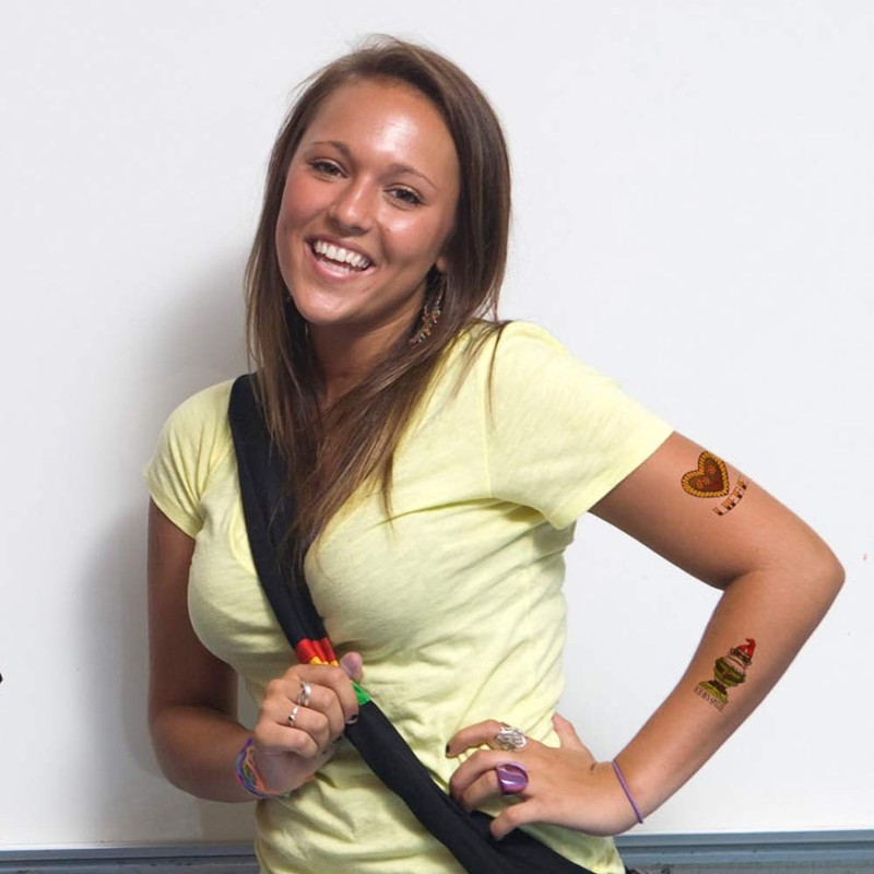 From a cute hedgehog and a cool gnome to a heart that says liebe, these temporary tattoos are going to go over big with your German students! Five sheets of eight designs, assortment of 40 tattoos in all, instructions on the back of each sheet. Each design measures over one inch across. If the ink needs to come off early, a little rubbing alcohol does the trick.