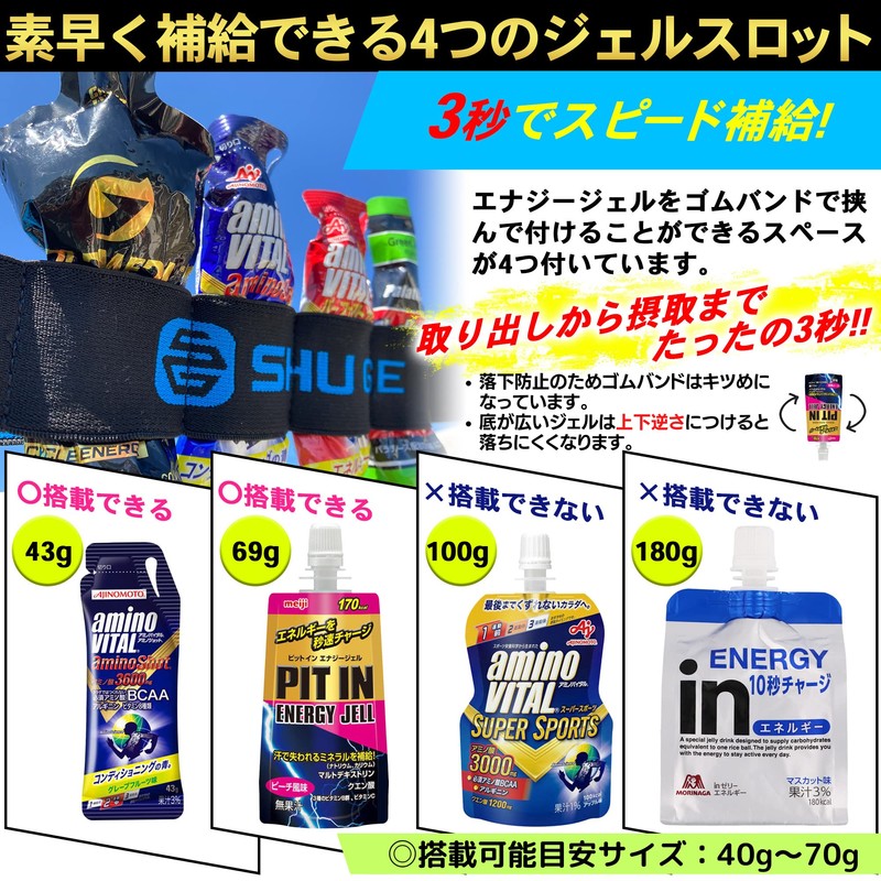 • Remove in 3 seconds - 4 gel storage spaces are located on the belt for intake. Allows for speedy replenishment without sacrificing your run. In order to prevent it from falling off while driving, we recommend putting the gel upside down when installing it