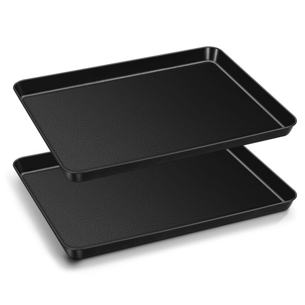 - HEAVY DUTY: These baking pans are crafted from heavy duty carbon steel core with black coating, Sturdy construction feels solid and proper weight in the hands, Superb Coated technology ensure these cookie sheets stand the test of time and the coating won’t chip