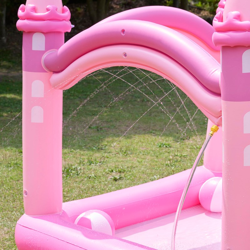 - FUN FOR A PRINCESS: Bright pink inflatable castle features a wading pool and sprinklers for a full day of play