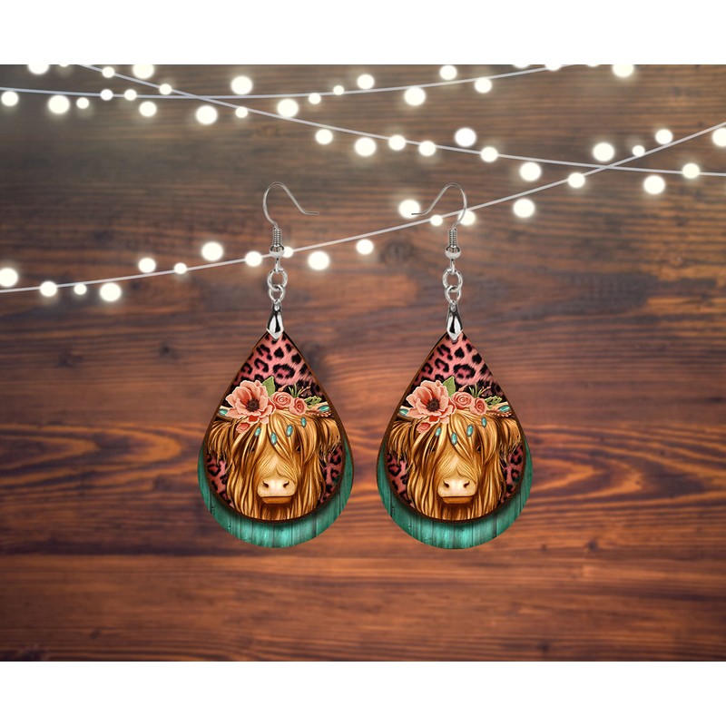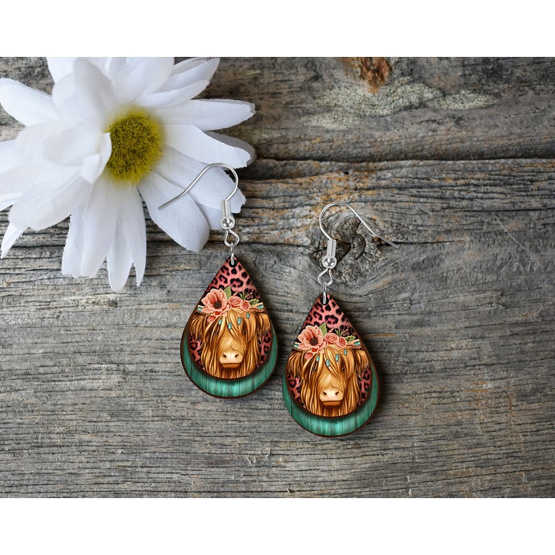 Teardrop Wood Earrings Light Weight Printed Image Dangle Jewelry (Highland Cow)