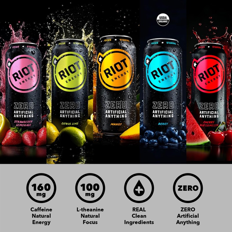 - Variety RIOT: 16 Ounces each (Pack of 12, 3 Mango RIOT, 3 Berry RIOT, 3 Citrus RIOT, 3 Cherry Watermelon RIOT)