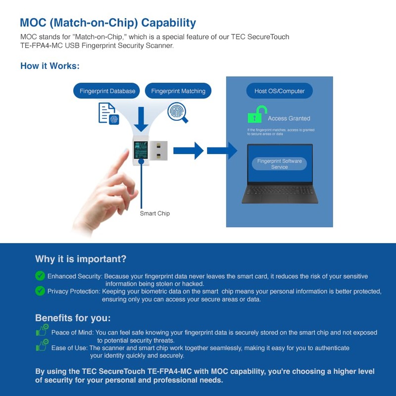 MOC technology is the heart of the TEC SecureTouch TE-FPA4-MC, ensuring that fingerprint matching is done on the chip itself. This method not only enhances security by isolating the fingerprint data from external software but also improves the processing speed and accuracy of recognition.