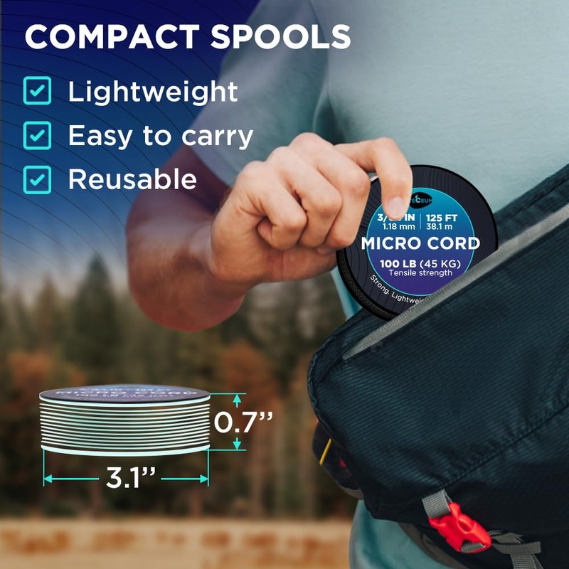 - Fuerte y compacto: la cuerda trenzada es delgada, ligera pero muy fuerte, enrollada en un carrete reutilizable compacto que puedes llevar contigo. Al ser menos de 2 mm de grosor, su resistencia mínima a la tracción es de hasta 100 libras.