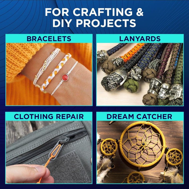 - Multiusos: ideal para aplicaciones de artes y manualidades, hacer pulseras, llaveros, cordones, atrapasueños, joyas, decoración del hogar y otros proyectos de bricolaje. Es ampliamente utilizado para reparaciones domésticas, como reparar partes de campanillas de viento, kits de emergencia, amarres de lona y actividades al aire última intervensión como camping, senderismo y pesca.