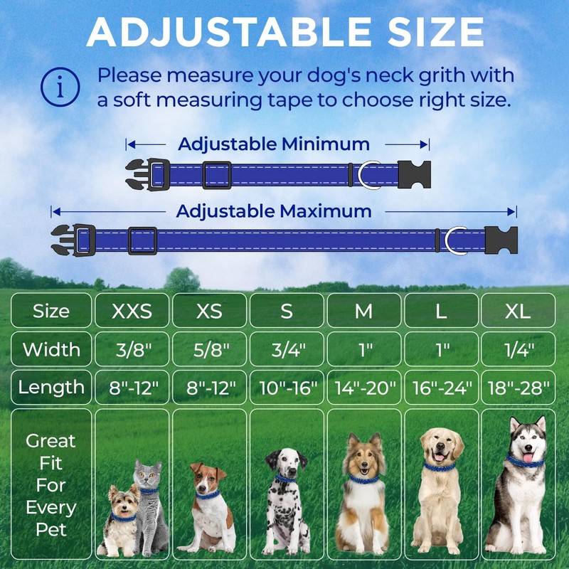 • 𝗔𝗗𝗝𝗨𝗦𝗧𝗔𝗕𝗟𝗘 𝗦𝗜𝗭𝗘: Careful design ensures easy size adjustment of the collar to provide a perfect fit for your pet: dogs and cats of all sizes and breeds.Fantastic choice for puppies and kittens. Great for all dog breeds including but not limited to: german shepherd, rottweiler, doberman, chihuahua, pitbull, bulldog, labrador, beagle, poodle, husky, yorkie and many more