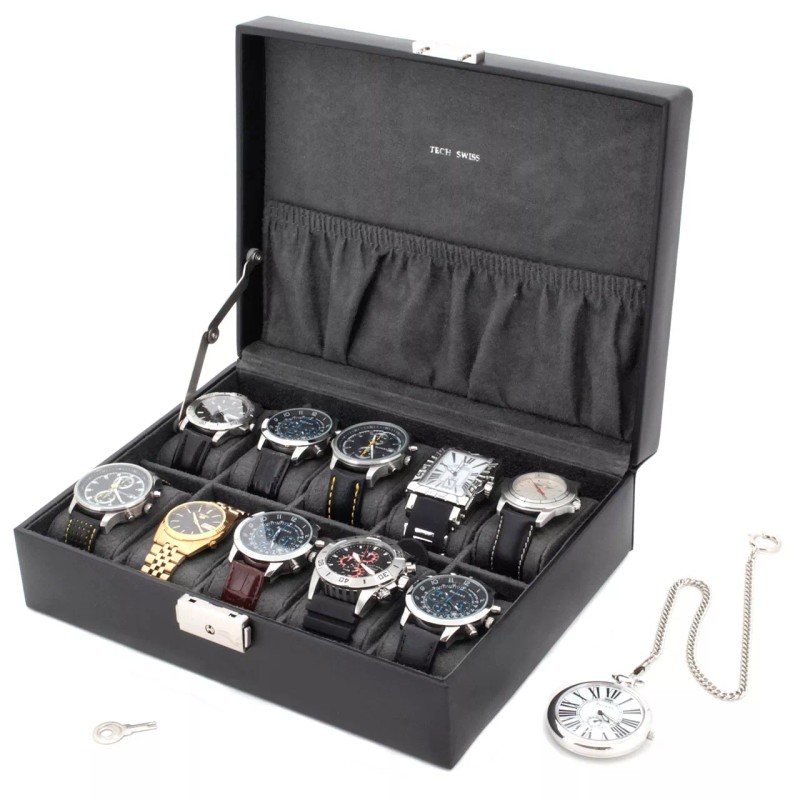 Tech Swiss Watch Box Storage Case Leather For 10 Watches With Lined Pocket TS410BLK