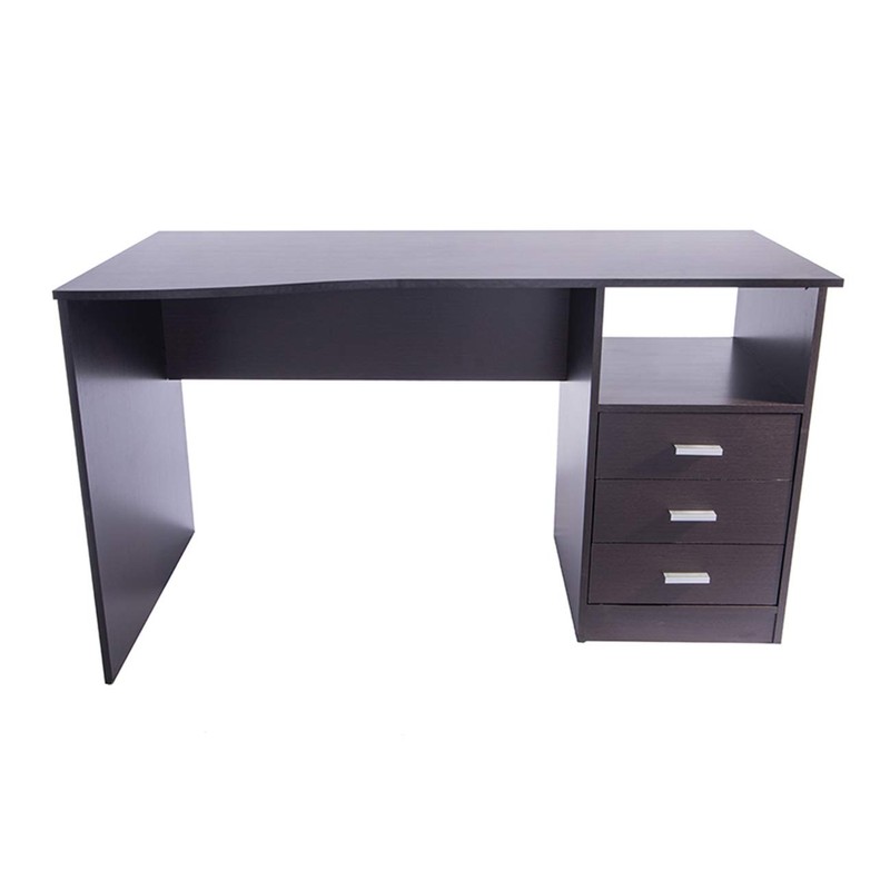 The Techni Mobili Classy Desk has a classy design of an expansive contoured desktop shape, and can be used as a computer workstation or as a drafting table. The under table side shelf and three drawers provide optimal storage. Desktop has a 90 lbs. weight capacity, the under table shelf can hold up to 19lbs and each drawer, 10lbs. Made of heavy-duty particle board panels with a moisture laminate finish, this desk will bring an elegant touch to any room or office. Color: Wenge Ships in 2 Boxes