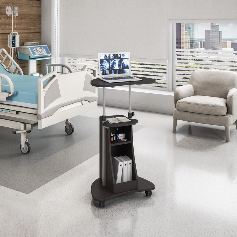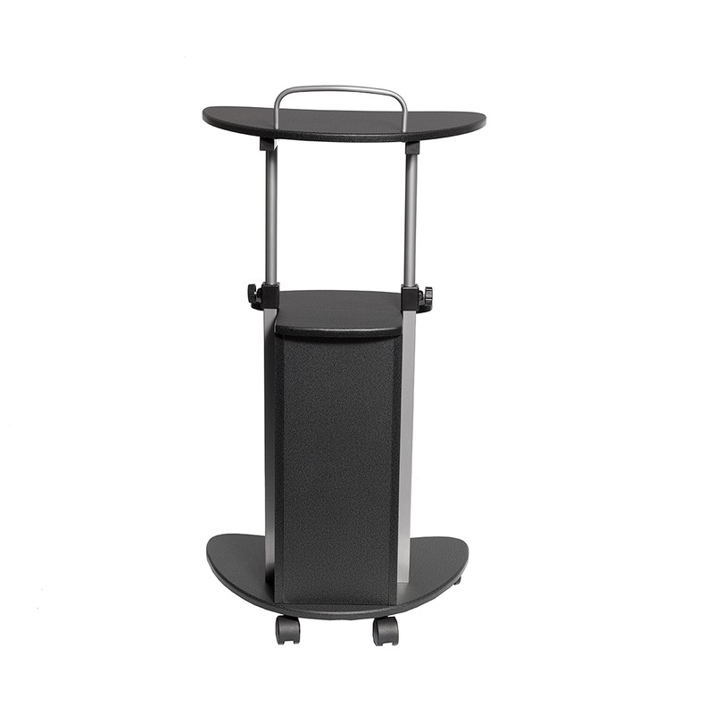 The Techni Mobili Sit-to-Stand Rolling Laptop Cart with Storage saves space while providing the laptop or writing setup you need. You can easily adjust the table height from 28" to 43" with dual adjustment knobs. The open storage compartment features an accessory shelf. Two of the fours non-marking nylon casters include a locking mechanism. The table top, accessory, and bottom shelves each have a 20lbs weight capacity and made of MDF panels with a moisture laminate veneer and a scratch-resistant powder-coated steel frame. Color: Black Graphite.