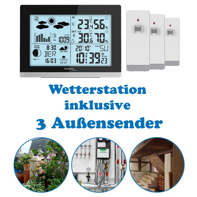 - The weather station WS 6762 comes with a total of 3 sensors (sensor type: TX205 DTH-IT). Thus, you can measure 4 different data for temperature and humidity (3 x outside, 1 x inside - of course you can also place the sensors inside, e.g. attic, cellar or even in the fridge if you want) and conveniently read from the display of the station.