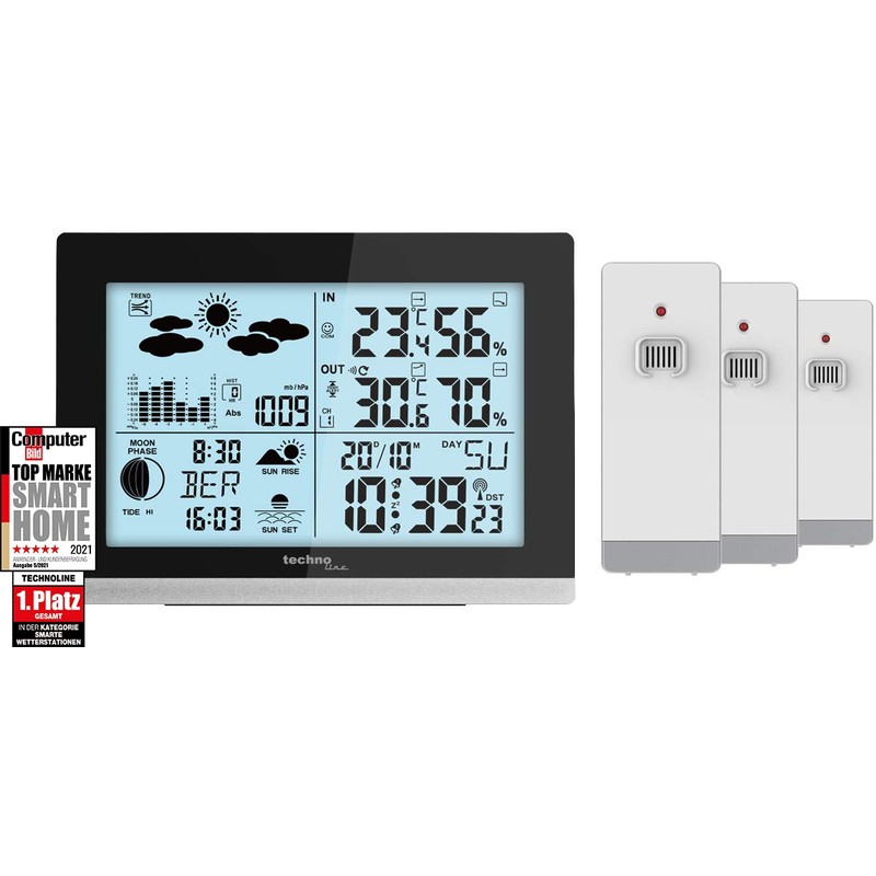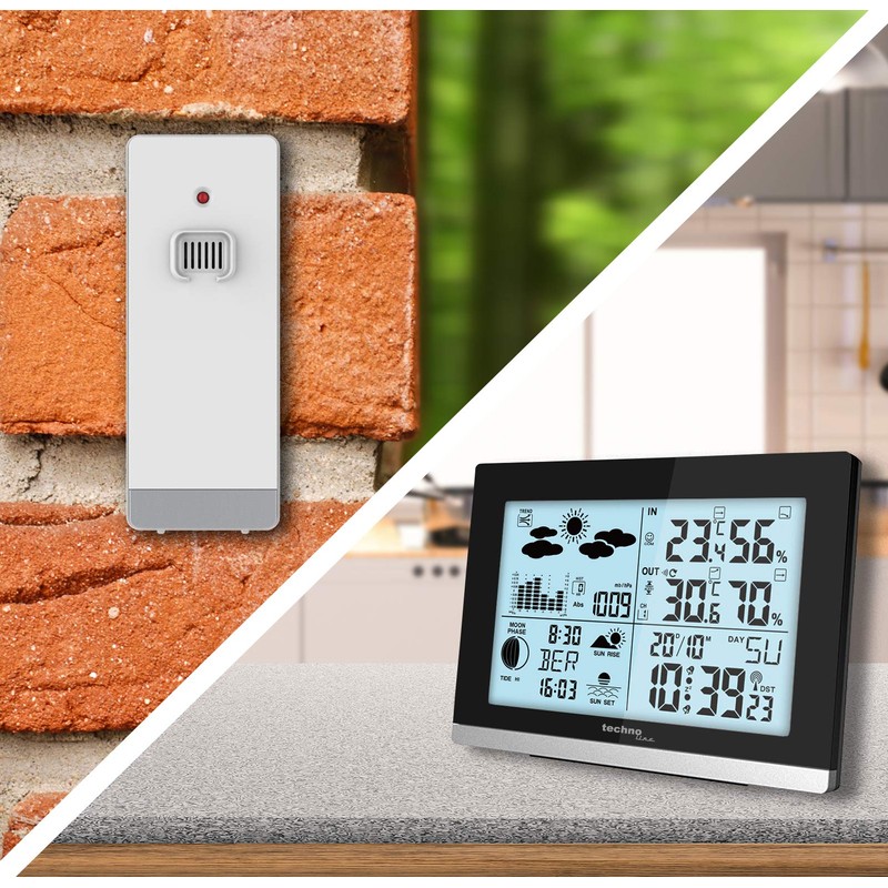 - This modern wireless weather station has a pleasantly large display and a white-blue backlight, which can be activated for a few seconds via the touch sensor with a light touch of the top edge. Reading the data is therefore no problem even in the dark.