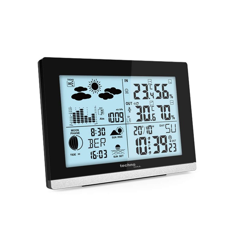 - Other functions: DCF-77 radio clock with manual setting option, 12/24 hour time display, weather forecast, sunrise and sunset display, and moon phase display