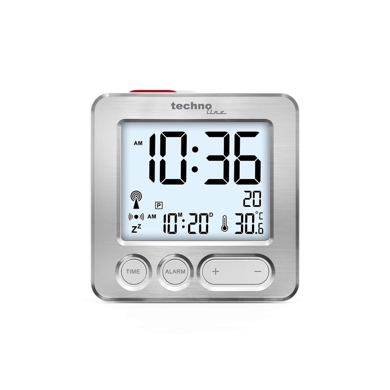 Technoline WT265 Handy and Convincing Modern Radio-Controlled Alarm Clock with Brushed Real Metal Front, Silver, Touch Activation for Lighting/Snooze, Date, Indoor Temperature, 66 x 21 x 66 mm