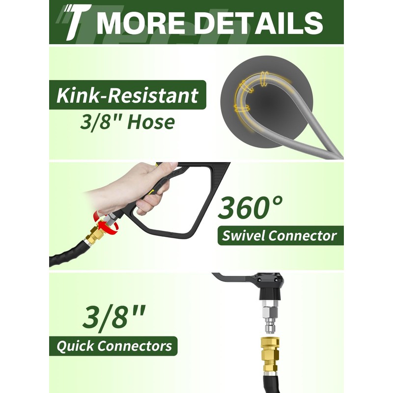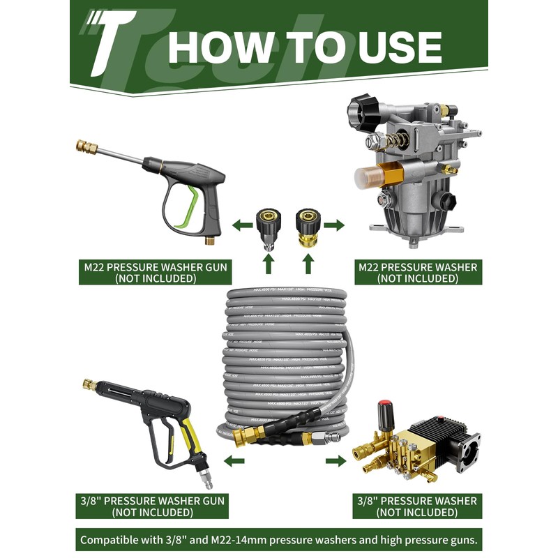 - 【Swivel Quick Connect Kink Resistant】4800 PSI high pressure washer hose is equipped with a swivel 3/8" quick connect, which will help you relax more, no hose kinks, and can be used at any angle. It is also equipped with 2 M22 14MM adapters, which can handle the cleaning work easier and faster, better support your home washing car, motorcycle, floor, window, driveway, roof, siding.