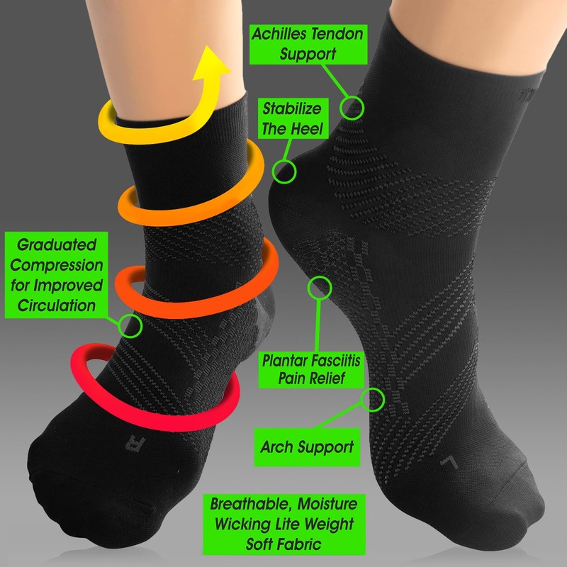 - Foot support and stability: Can help with arthritis, achilles tendonitis, sprains, and muscle fatigue; slim, breathable, moisture-wicking material ensures strong compression without sacrificing comfort