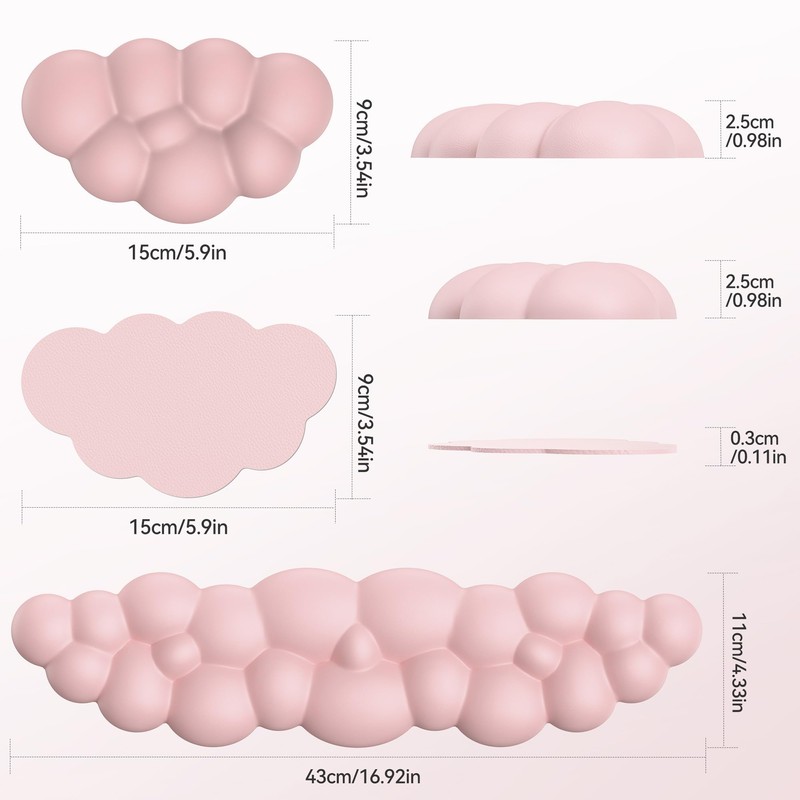 - 【Ergonomic Design Cloud Wrist Rest】 The three-in-one design of wrist rest for computer keyboard, mouse wrist rest and coaster can be used in a scientific way to improve work efficiency.The keyboard wrist pad adopts cloud-shaped design, perfectly fits the wrist curve, provides soft support, and relieves wrist fatigue caused by long-term use of keyboard and mouse.The wrist support for keyboard set is the perfect desktop companion for gaming and office work.