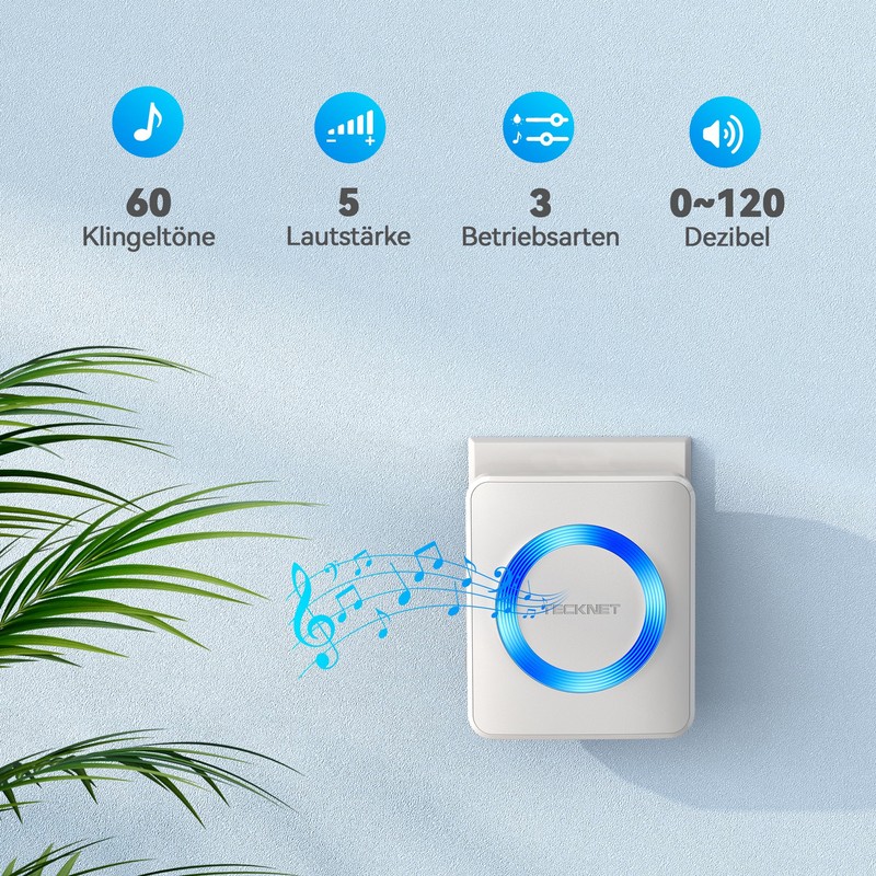 - 5 Tonstufen & 60 Verschidene klngeltoneDer klingel funk bietet satten und klaren Klang. Es gibt 5 Tonstufen zur Auswahl verschiedener T?ne(0 dB bis 120dB). Die Klingel verfgt ber 60 Glocken Ihren Bedrfnissen gerecht zu werden.drcken Sie den Next oder Previous Knopf, um einfach aus 60 Melodien zu w?hlen.