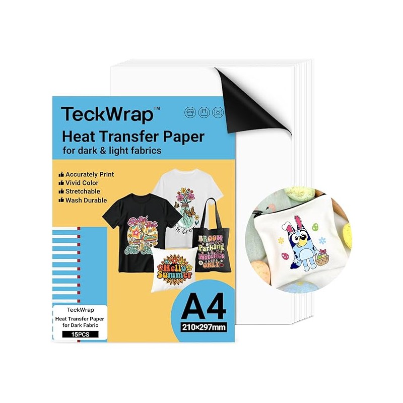 TECKWRAP Printable Heat Transfer Paper for T-Shirts 15 Sheets, 8.3" X 11.7" Printable Heat Transfer Vinyl for Inkjet Printer, Iron on Transfer Paper for Light and Dark Fabric (Matte White)