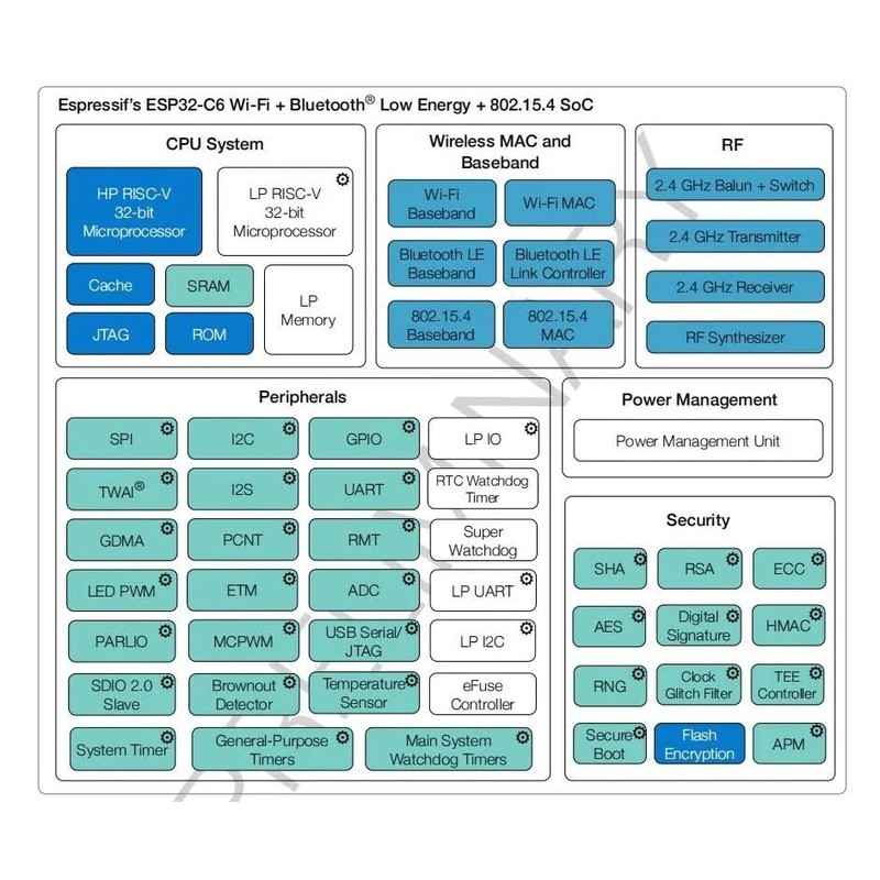 - ESP32-C6: The ESP32-C6 Nano Development Board is a development board released by MuseLab based on the Lexin ESP32-C6 WROOM-1 module. It features a built-in USB-to-serial port and full-color RGB LED, allowing developers to quickly create verifications and prototypes.