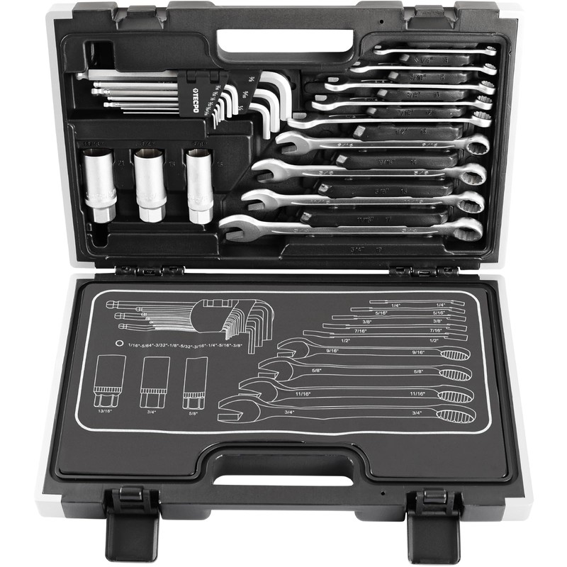 - 9 combination wrenches: 1/4, 5/16, 3/8, 7/16, 1/2, 9/16, 5/8, 11/16, 3/4