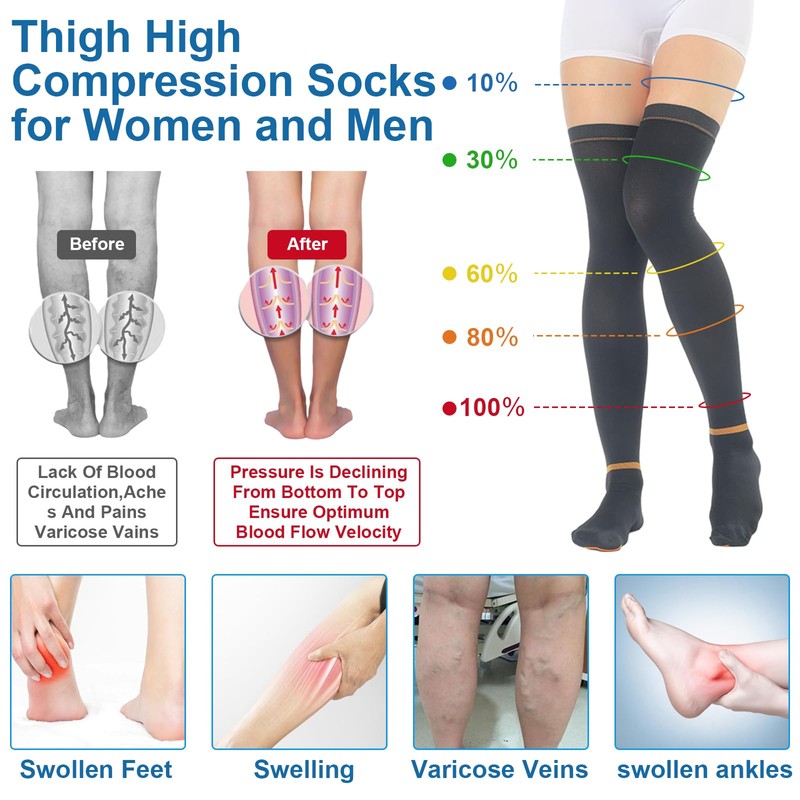 - Ideal for Sports & Daily Wear: Anti-embolism thigh high stockings Reduces muscle fatigue, especially if on your feet for long periods of time, traveling or all sports e.g. cross fit, skiing, running, hiking and more. In daily life, perfect compression socks for runners, travelers, pregnant women, maternity, waitress.