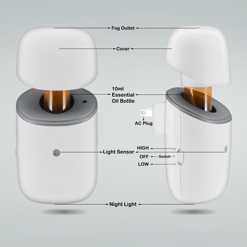 - Easy Use& Smart Sensing Lights UpSimply plug the wall diffuser into the plug and it's easy to use,offering easy setup without the need for batteries,low/high and off switch adjust fragrance levels and personalized scenting experience,the bottom of essential oil diffuseris embedded with auto night light,from the living room to your workspace,enhance your home's ambiance.
