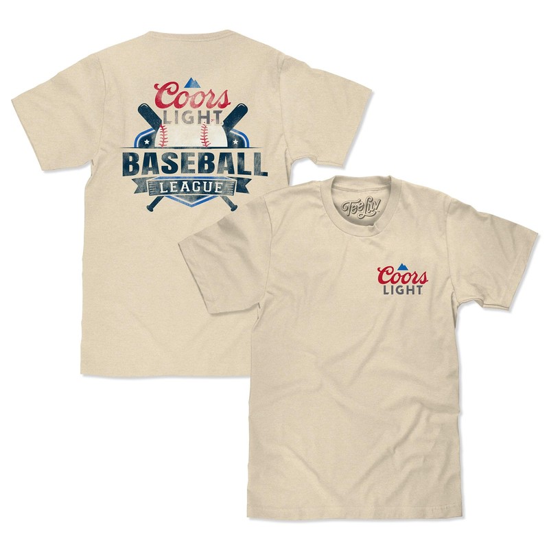 - Subtle Front, Striking Back: This alcohol logo shirt features the classic Coors Light mountain logo on the left chest, and a bold baseball themed graphic along with the "Coors Light Baseball League" text on the back.